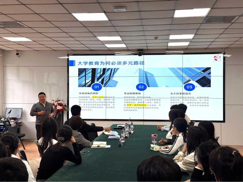 讲座环节,崔思锋以“多元发展路径:升学・就业・留学”为题,结合对AI教育领域实践的研究,为大家解析大学生能力多元发展的策略。他从“大学目标再定义”切入,指出在技术迭代的背景下,单一的“考研—绩点”评价体系已难满足需求;并以北大改革为例,解读等级制、容错机制,之后探究了如何为学生创造多元成长空间,引导学生结合自身优势规划发展方向。