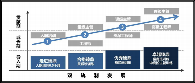 根据个人职业兴趣与专长,选择管理职或专业技术职双轨发展晋升通道,在不同发展阶段,相应训练满足个人成长。